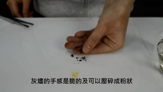 7,灰燼的手感是脆的及可以壓碎成粉狀