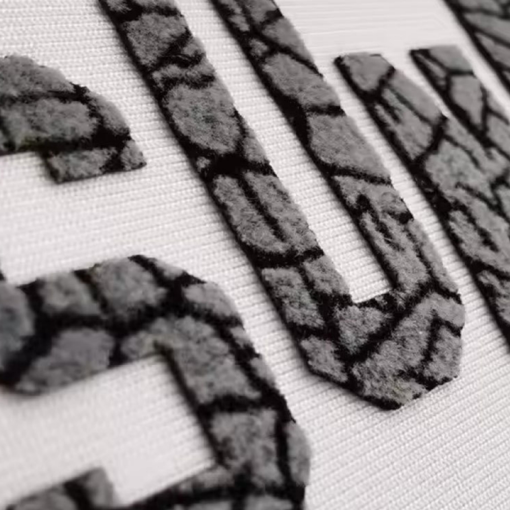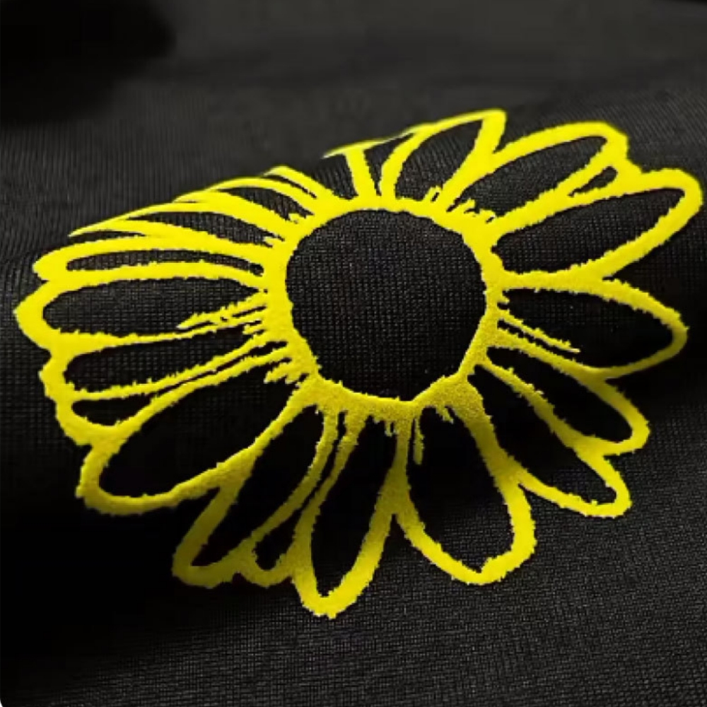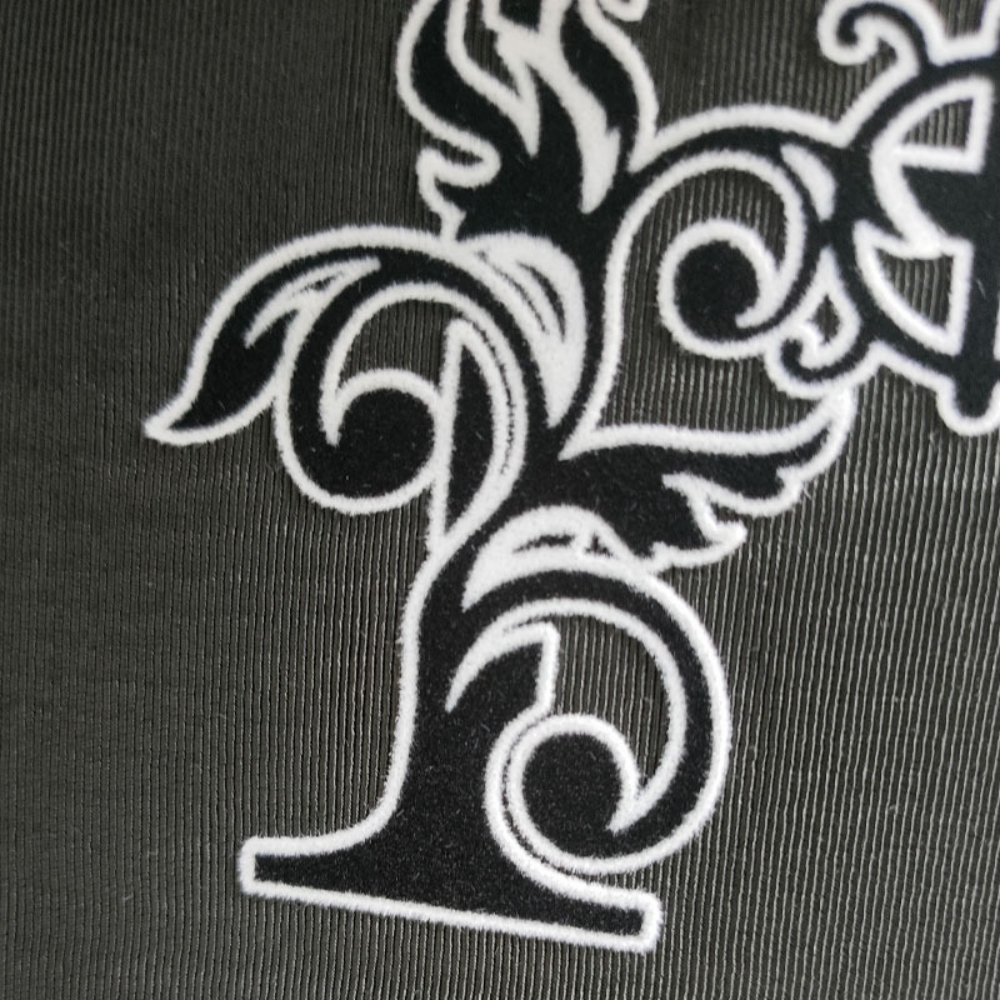 答:植絨燙畫是一種帶有立體絨毛質感的特殊印花工藝。它與普通平面印花最大的不同在於,其表面覆蓋著一層細膩柔軟的短纖維,形成類似絲絨的觸感和外觀,能為您的設計帶來獨特的復古感和高級感,讓圖案從視覺和觸覺上都脫穎而出。