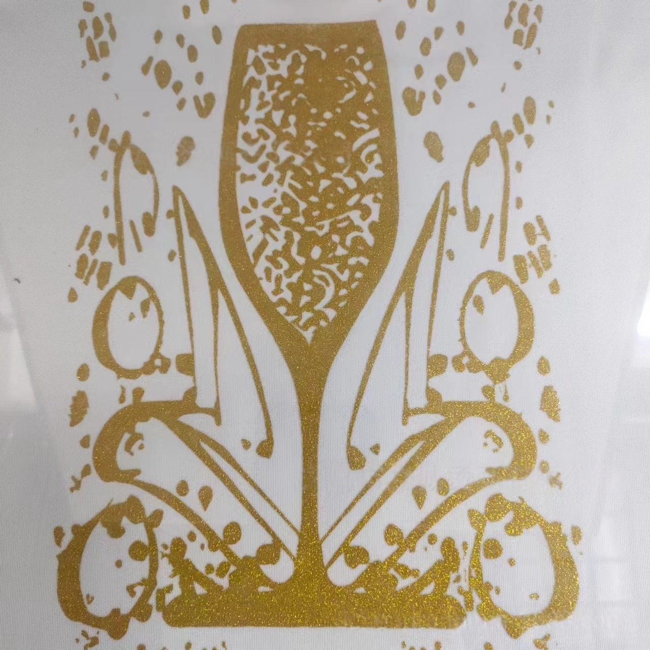 答:閃粉燙畫提供多種豐富的閃粉顏色供客戶選擇,包括常見的金、銀、紅、藍以及各種幻彩顏色。雖然它不像傳統彩色印刷那樣可以做漸層色,但透過單色或多色閃粉的拼接搭配,依然能呈現出極具視覺衝擊力的精美圖案,滿足絕大多數的設計需求。