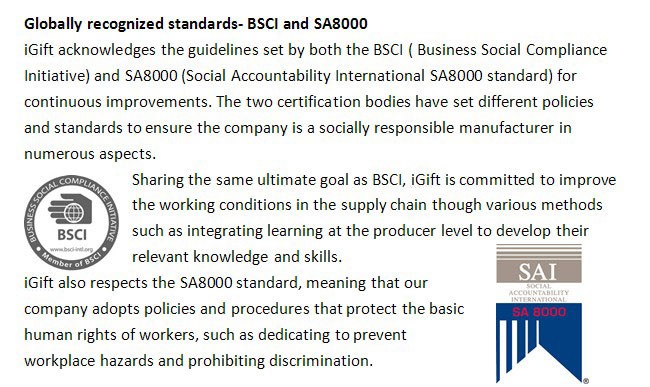 iGift acknowledges the guidelines set by both the BSCI (Business Social Compliance Initiative) and SA8000 (Social Accountability International SA8000 standard) for continuous improvements. The two certification bodies have set different policies and standards to ensure the company is a socially responsible manufacturer in numerous aspects.