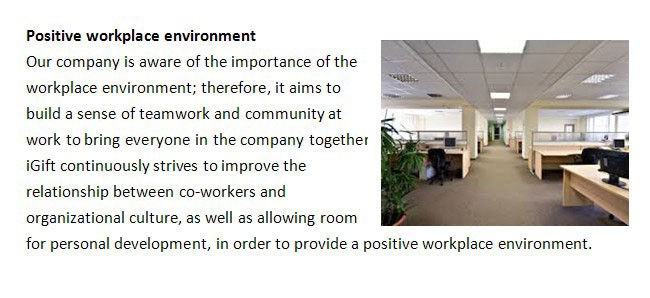 iGift continuously strives to improve therelationship between co-workers and organizational culture, as well as allowingroom for personal development, in order to provide a positive workplaceenvironment.