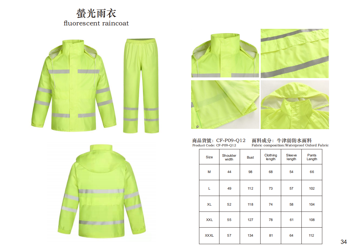 - 便捷設計: 拉鍊式門襟,方便穿脫;鬆緊袖口和褲腰,有效防止雨水滲入。