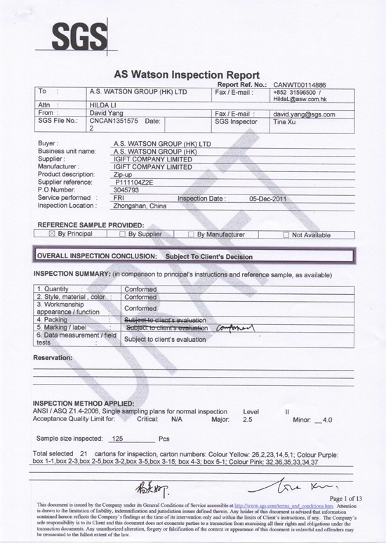 Through corporation with renown customers, we developed testing and inspection prodcedures which could satisfy different customers' quality requirements. From physical strength test, washing test, fastness test to heavy metal and harmful chemical test, iGift could provide full range of test to ensure that our product is up to different requirements from Oeko-text Standard Class 1, REACH, National General Safety Technical Code for Textile Products (GB Standard), and the Consumer Product Safety Improvement Act (CPSIA) which regulates the phthalates and lead for children's product with age 12 or under.