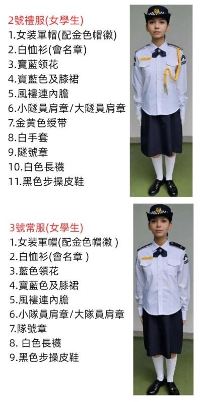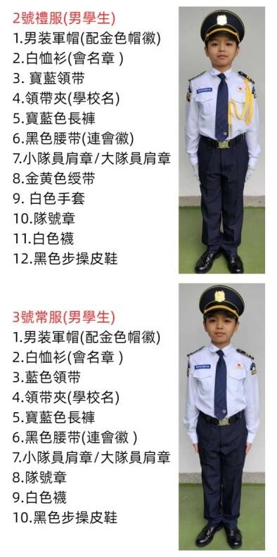 制服通常包括西裝外套、襯衫、長褲(對於男生)或裙子(對於女生),以及必要的頭飾,如帽子。