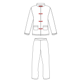 | Pants | Matching red pants, loose-fitting with a slight gathered effect at the ankles. These pants also have a gold embroidered design, possibly similar to that on the jacket, running down the side. |