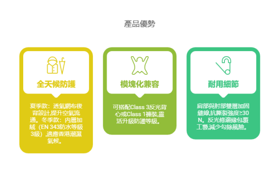 o 冬季款:內層加絨(EN 343防水等級3級),適應香港潮濕氣候。