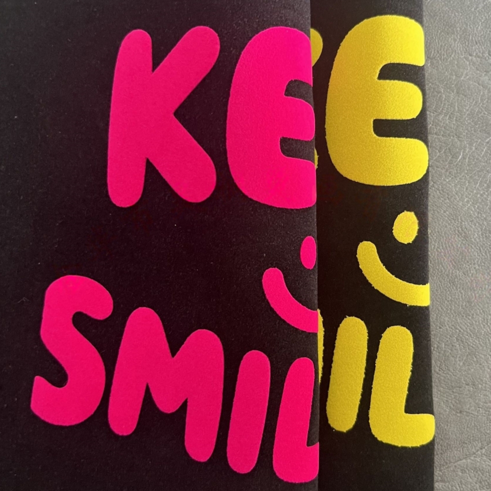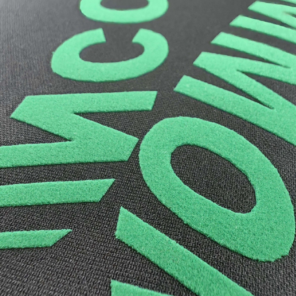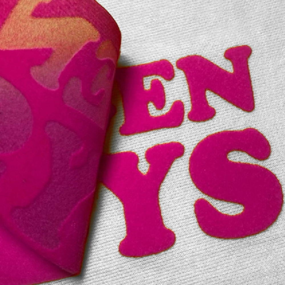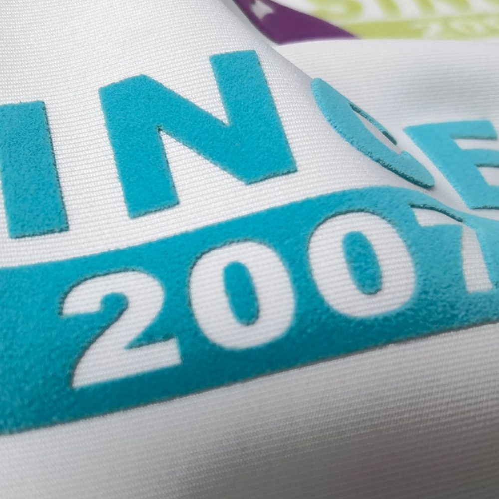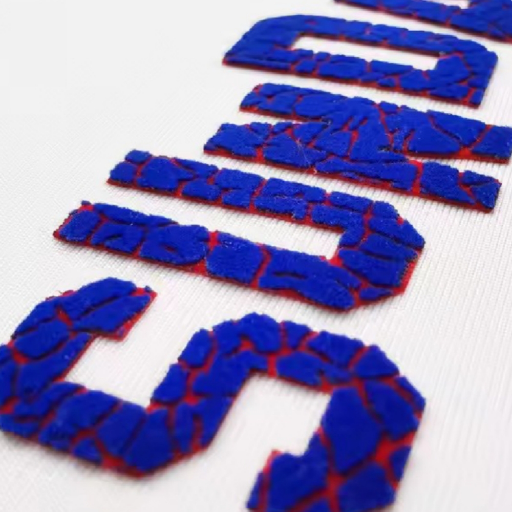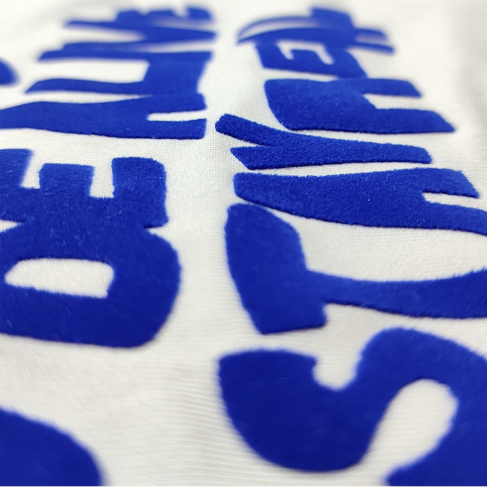 答:植絨燙畫是一種帶有立體絨毛質感的特殊印花工藝。它與普通平面印花最大的不同在於,其表面覆蓋著一層細膩柔軟的短纖維,形成類似絲絨的觸感和外觀,能為您的設計帶來獨特的復古感和高級感,讓圖案從視覺和觸覺上都脫穎而出。