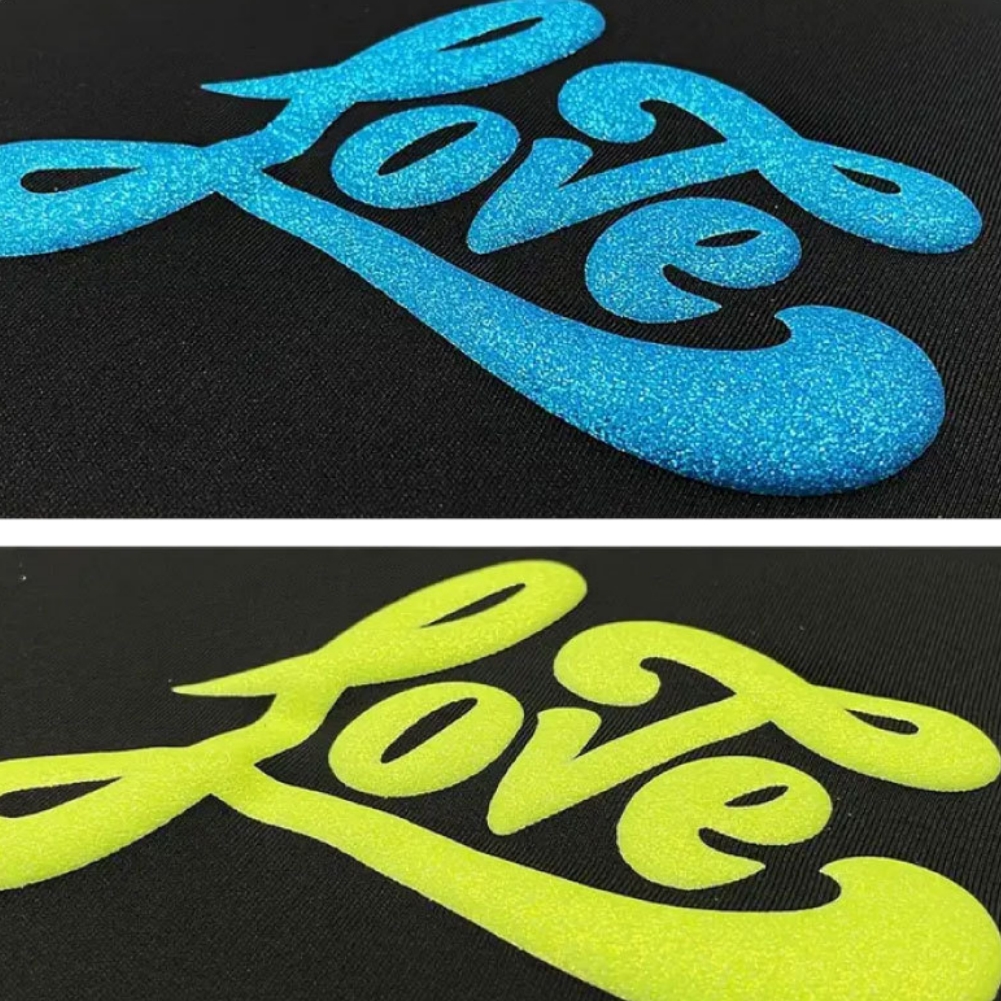 答:普通燙畫的表面通常是平滑且呈現啞光或亮面的效果,而閃粉燙畫則是在材質中加入了細密的閃光顆粒。這使得閃粉燙畫在光線照射下會折射出耀眼的光芒,表面帶有微微的磨砂立體觸感,視覺效果比普通燙畫更加華麗且具有豐富的層次感。