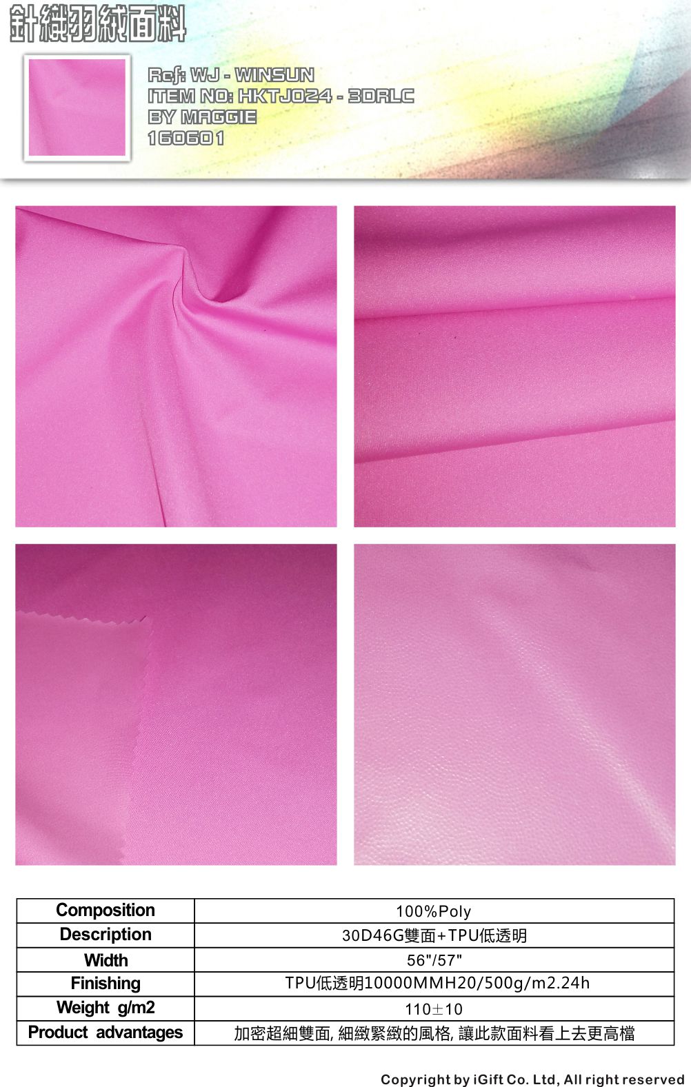 WJ-WNSN 針織羽絨面料9  Composition:100%Polyester  Description:30D46G雙面+TPU低透明  Product advantages:加密超細雙面,細緻緊緻風格 正面照