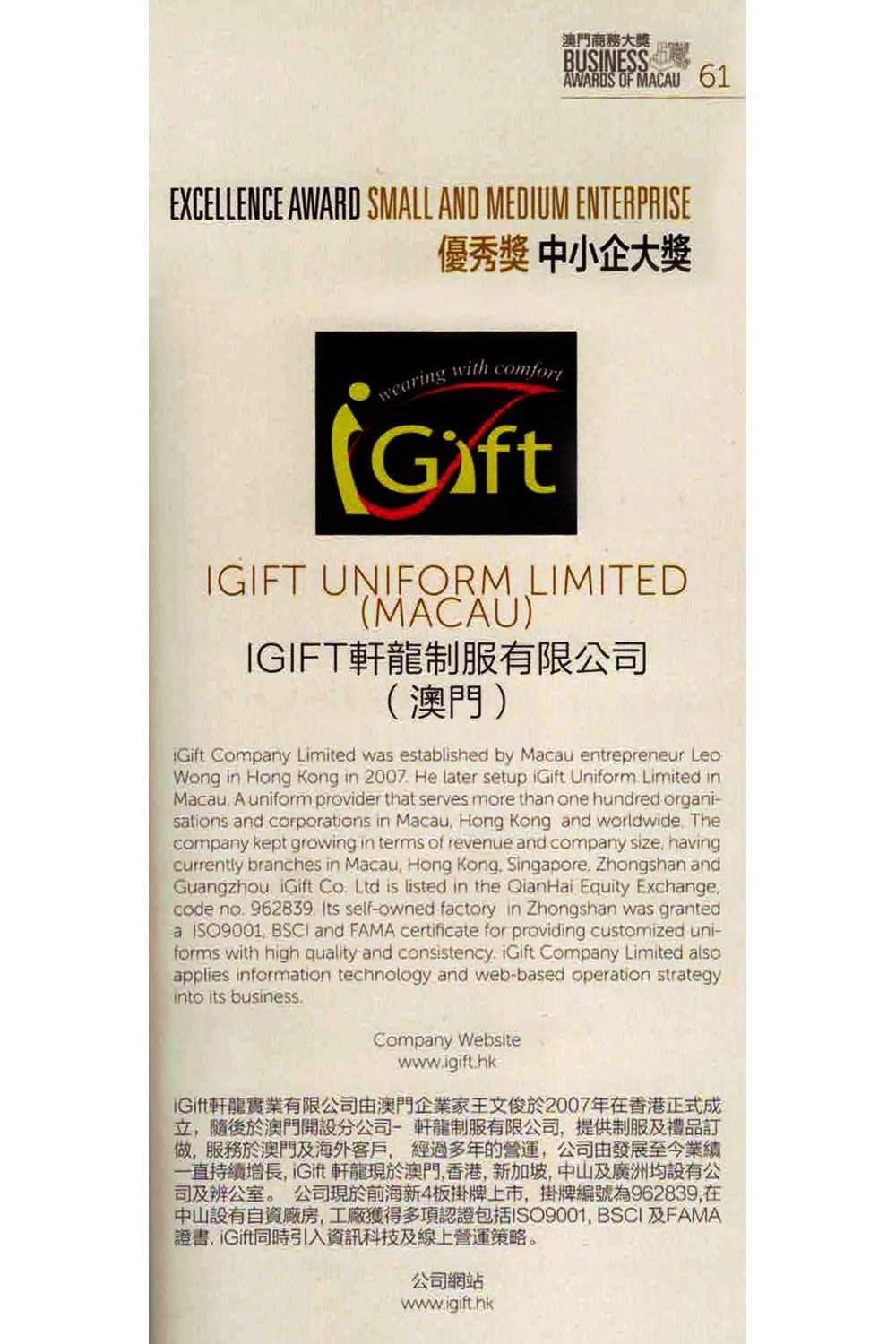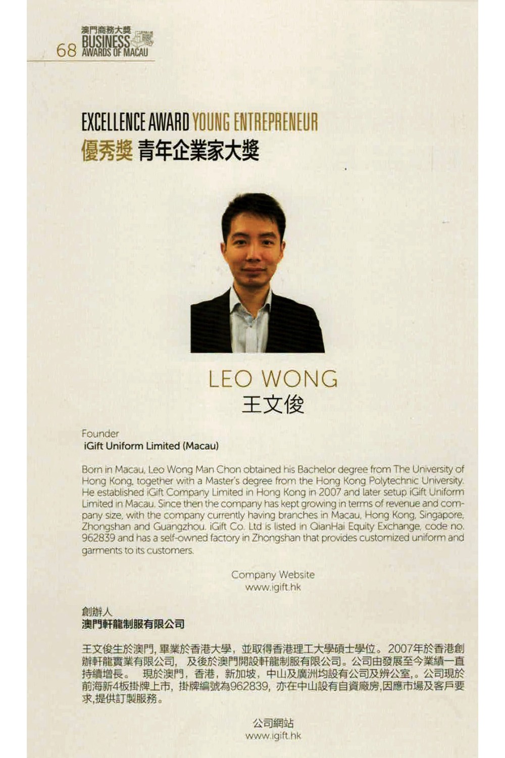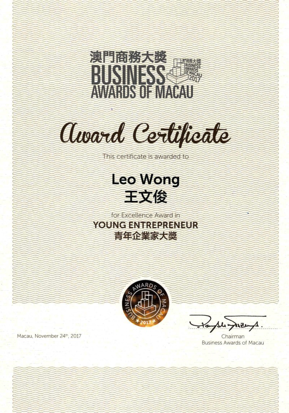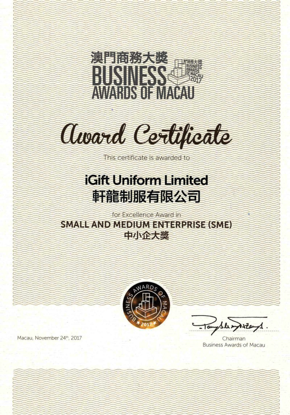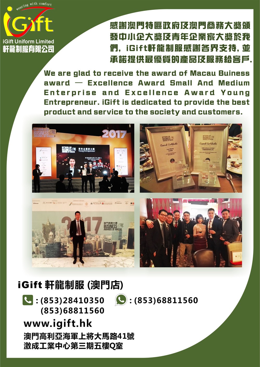 We are glad to receive the award of Macau Buiness award – Excellence Award Small And Medium Enterprise and Excellence Award Young Entrepreneur . iGift is dedicated to provide the best product and service to the society and customers