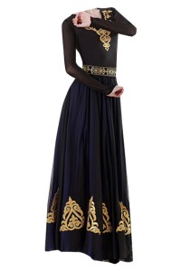 This is a Tibetan costume gown designed for female aristocrats. It features a unique contrast pattern, made with a poly cotton blend for comfortable wear. This gown has a crew neck, long sleeves, and a regular length. It's a pullover style with a comfortable fit.