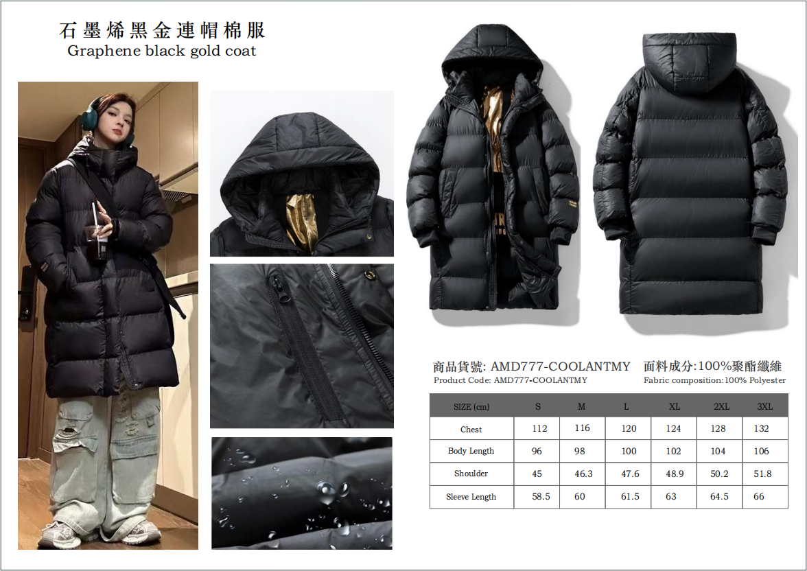 - 石墨烯保暖科技 (加長款): 石墨烯材料具有優異的遠紅外線輻射性能,能有效將人體熱量反射回體內,達到高效保暖的效果,同時輕盈透氣,避免臃腫感。