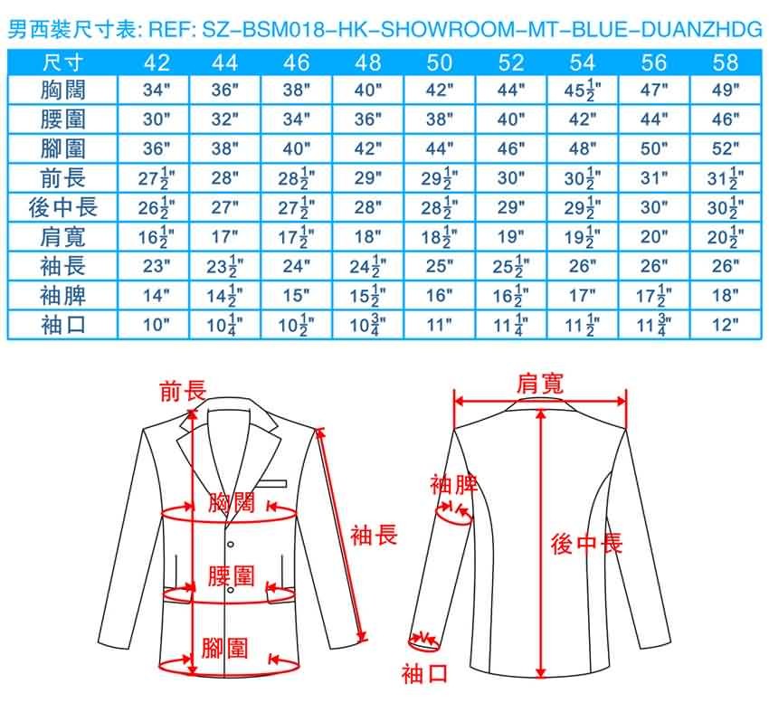 男西裝尺寸表:REF:SZ-BSM018-HK-SHOWROOM-MT-BLUE-DUANZHDG