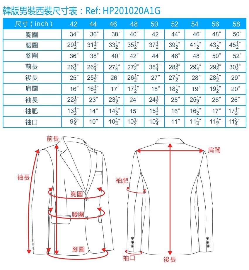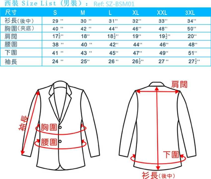 - 務必參考產品尺寸表: 不同款式、不同布料的西裝版型可能存在細微差異,請務必以您打算購買的產品頁面上的尺寸表為最終依據。