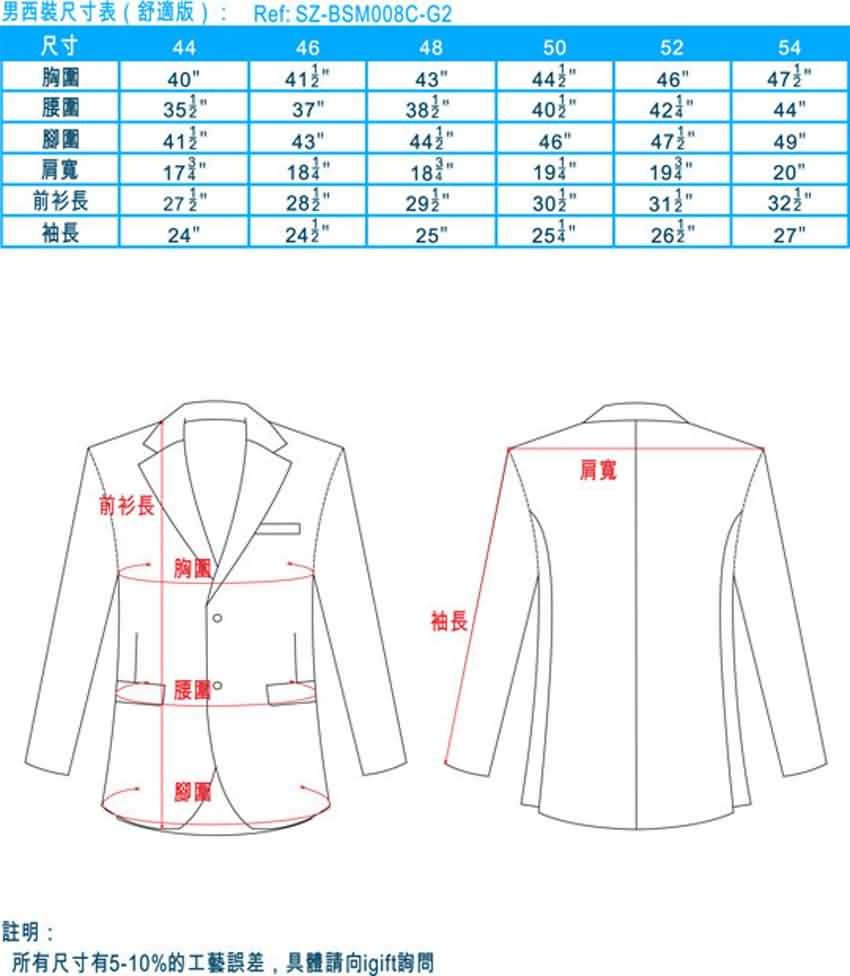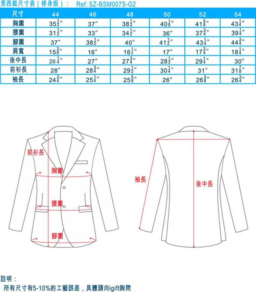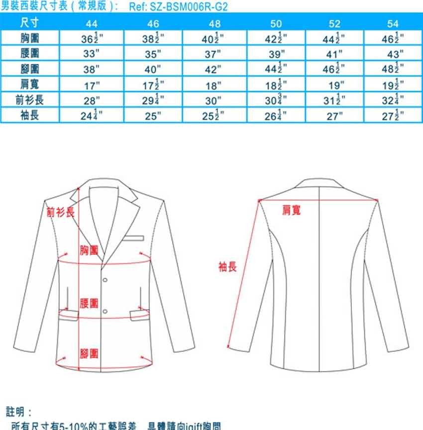 男裝西裝尺寸表(常規版):Ref:SZ-BSM006R-G2