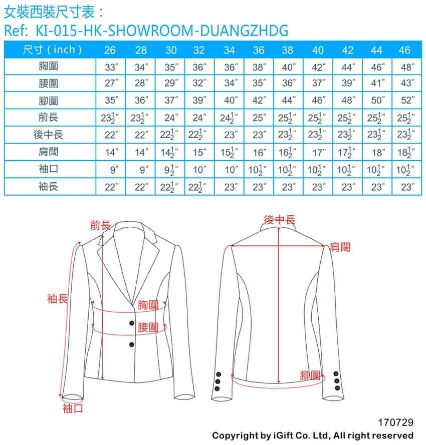 女裝西裝尺寸表:Ref:KI-015-HK-SHOWROOM-DUANGZHDG