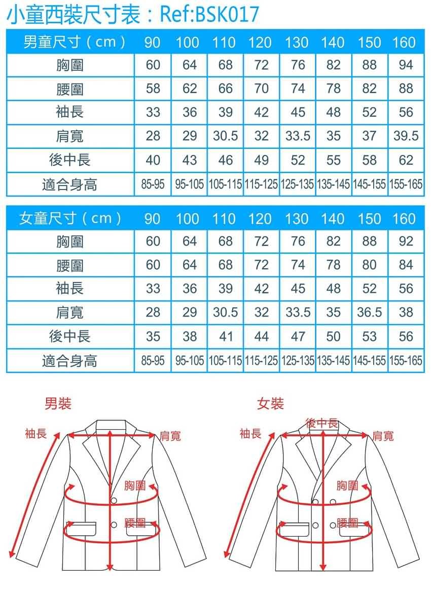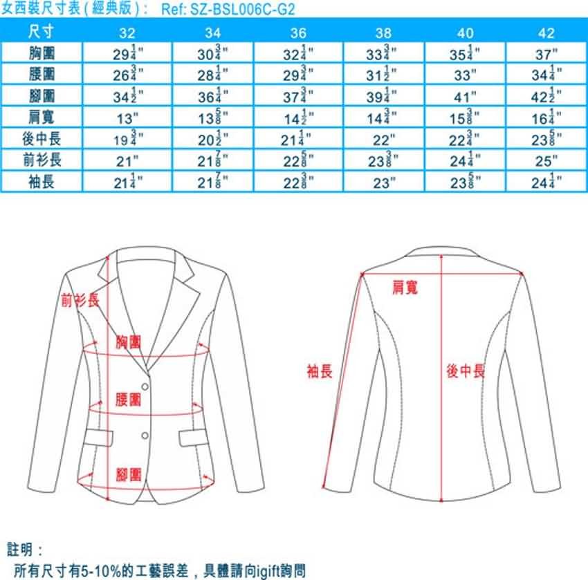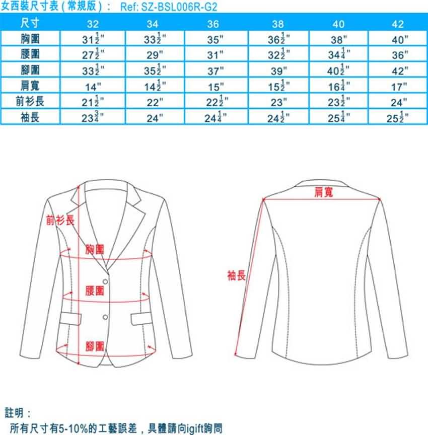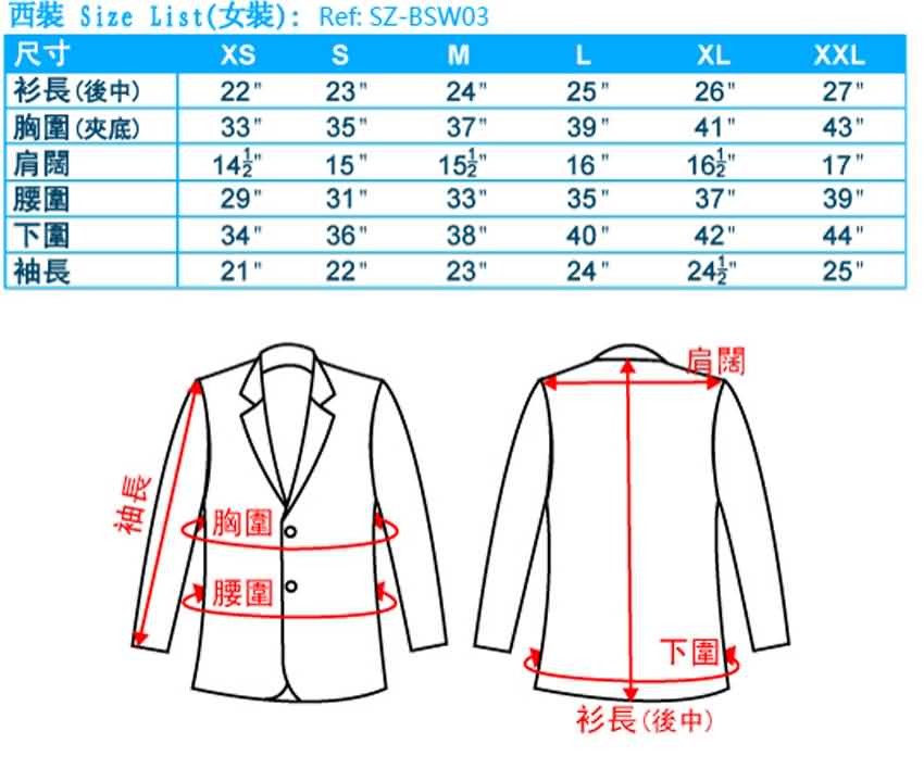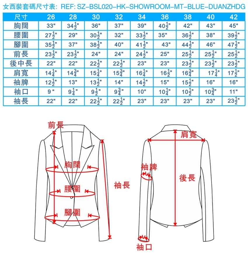 女西裝套碼尺寸表:REF:SZ-BSL020-HK-SHOWROOM-MT-BLUE-DUANZHDG