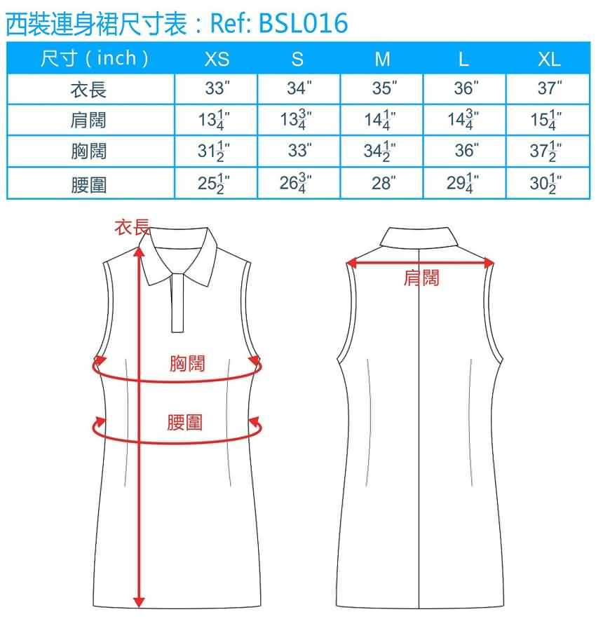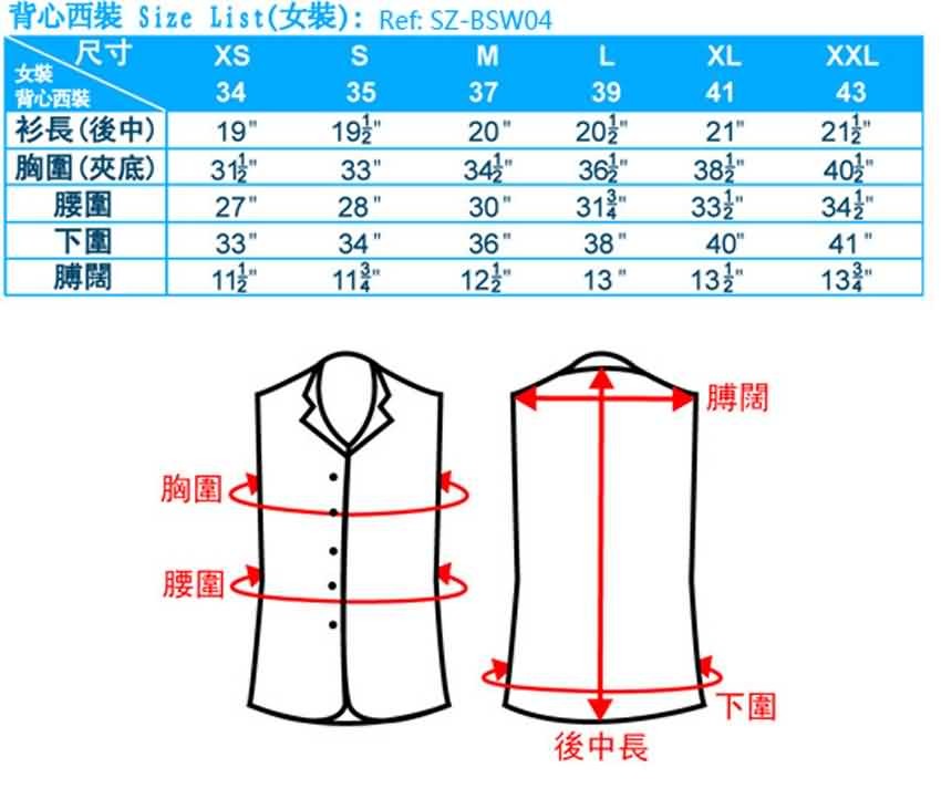 背心西裝Size List(女裝):Ref:SZ-BSW04