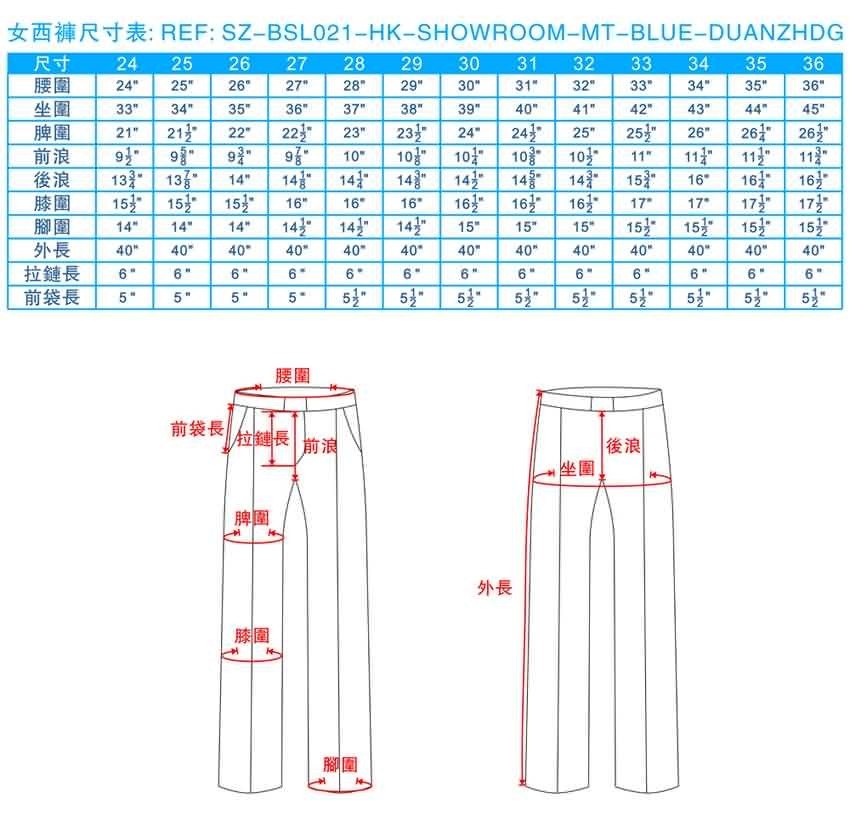 女西褲尺寸表:REF:SZ-BSL021-HK-SHOWROOM-MT-BLUE-DUANZHDG