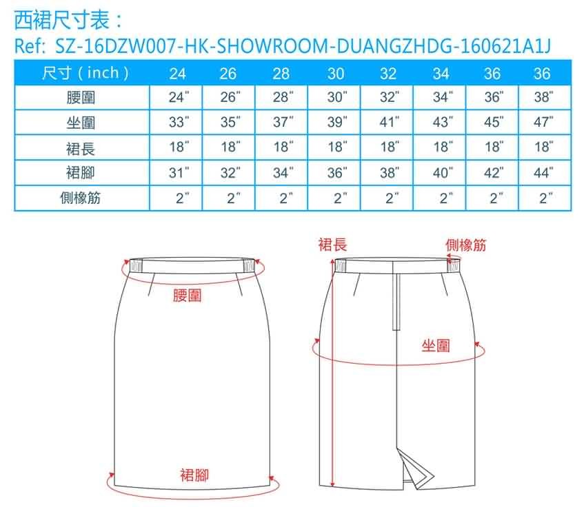 西裙尺寸表:Ref:SZ-16DZW007-HK-SHOWROOM-DUANGZHDG-160621A1J