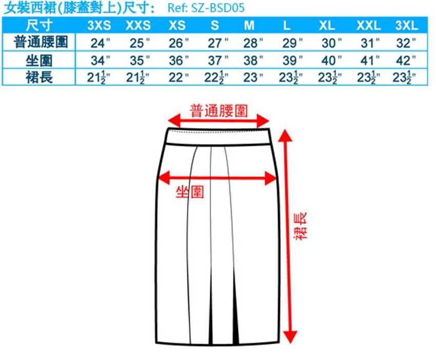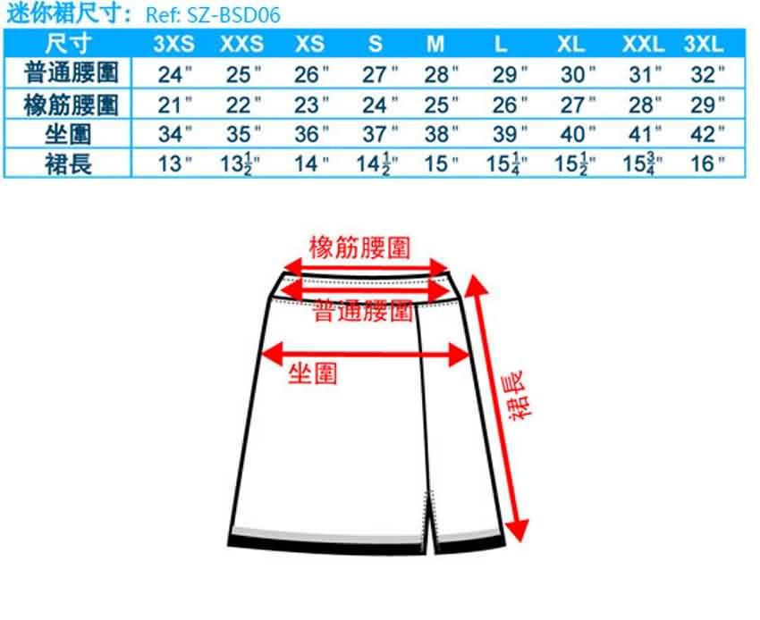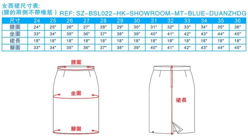 女西裙尺寸表:(腰的兩側不帶橡筋)REF:SZ-BSL022-HK-SHOWROOM-MT-BLUE-DUANZHDG