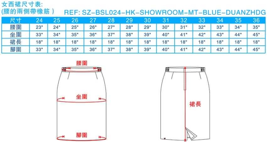 女西裙尺寸表:(腰的兩側帶橡筋)REF:SZ-BSL024-HK-SHOWROOM-MT-BLUE-DUANZHDG