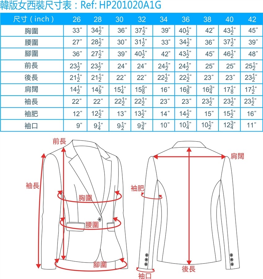 韓版女西裝尺寸表:Ref:HP201020A1G![]()