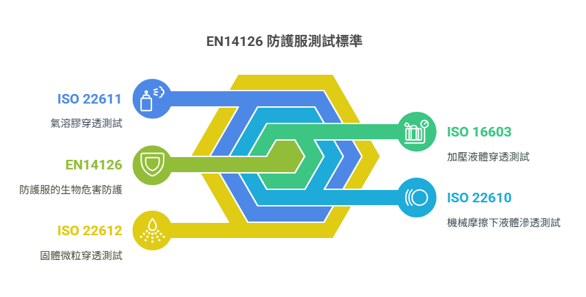 · EN14126:針對生物感染性物質(病毒、細菌),側重多種媒介(液體、氣溶膠、微粒)的穿透測試。