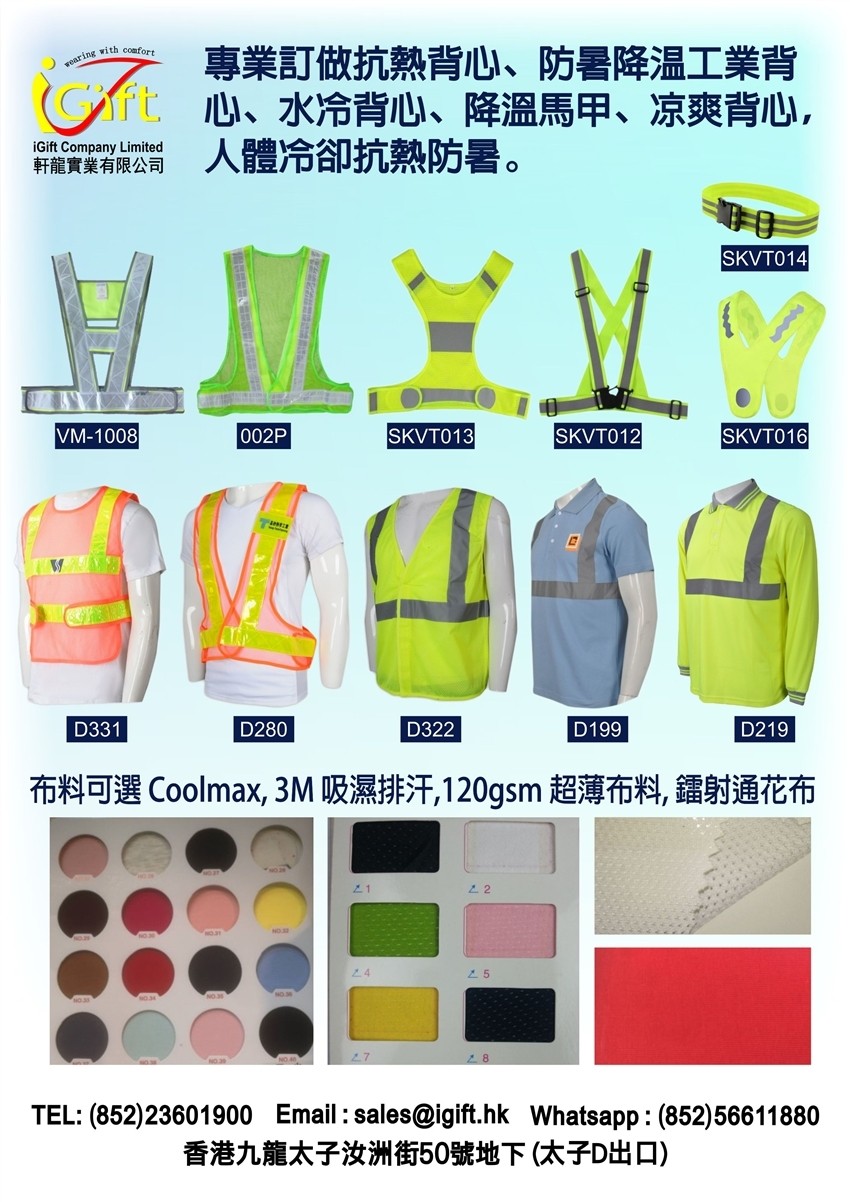 喺香港炎熱潮濕嘅氣候下,戶外及高溫環境工作者時刻面臨中暑同安全風險。iGift Company Limited 專業為各行各業訂做高效能嘅抗熱背心、防暑降溫工業背心、水冷背心、降溫馬甲、涼爽背心,以及各類符合安全標準嘅香港反光衣,致力提供人體冷卻抗熱防暑嘅全面解決方案。我哋嘅產品布料可選Coolmax、3M吸濕排汗、120gsm超薄布料、針織通花布等,確保功能性與舒適度兼備。