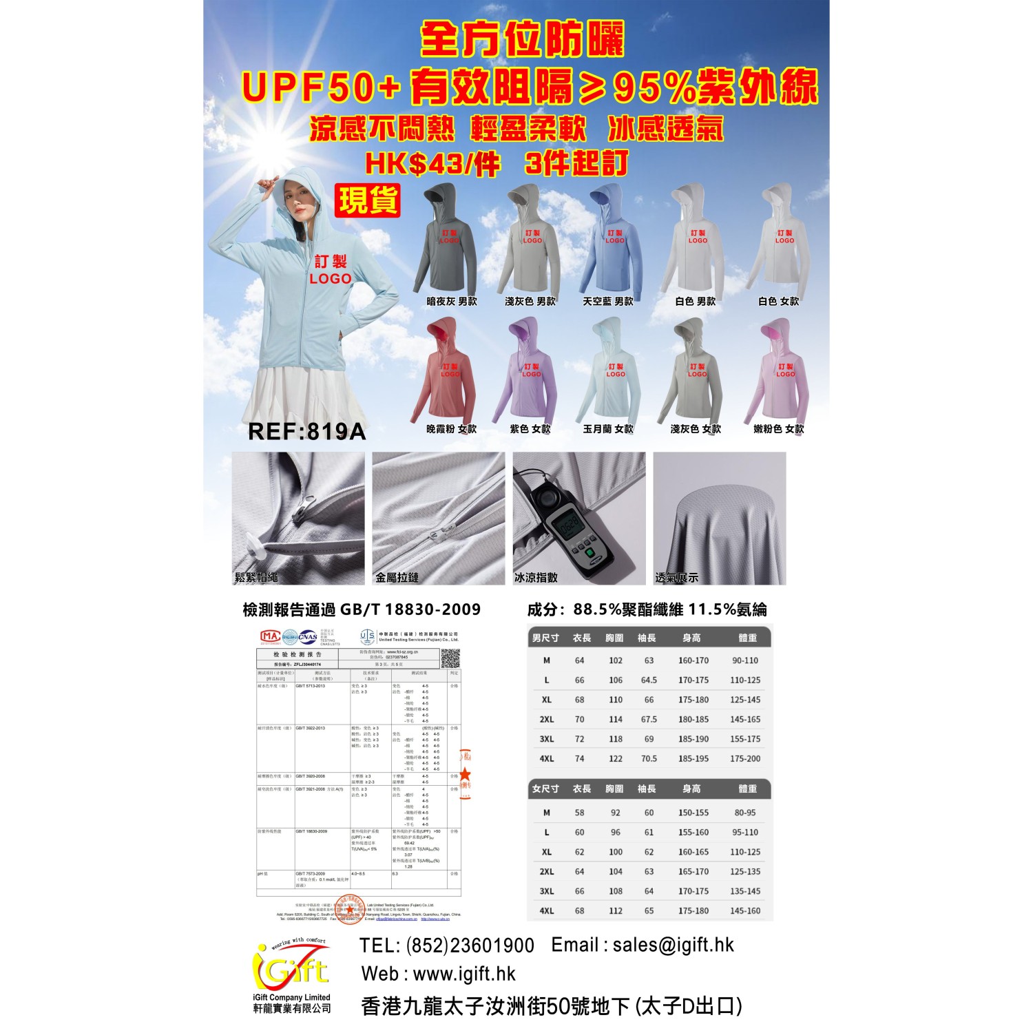 香港嘅夏天,太陽有幾猛烈,相信大家都身同感受。無論是戶外工作、團體活動,還是假日消閒,一件專業的防曬外套香港都不可或缺。iGift Company Limited 現貨推出 REF:819A 全方位防曬外套,具備經權威認證的 UPF50+ 防曬系數,能有效阻隔超過95%紫外線,而且質地輕盈柔軟、冰感透氣,告別傳統防曬衣的悶熱感!我們提供印製Logo外套服務,只需3件起訂,是您自訂外套的最佳選擇。