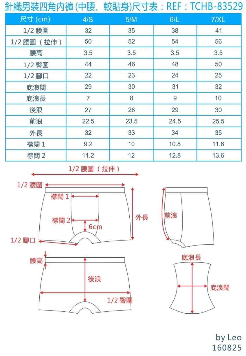 針織男裝四角內褲(中腰、較貼身)尺寸表:REF;TCHB-83529