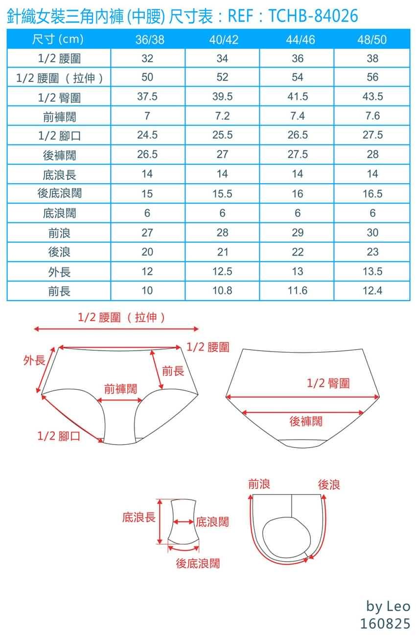 針織女裝三角內褲(中腰)尺寸表:REF:TCHB-84026
