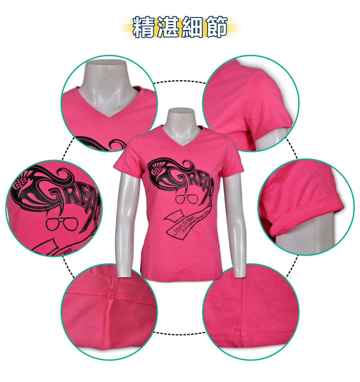 | 上衣 | 粉紅色T恤,正面印有黑色圖案 |