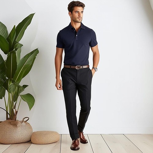 搭配西裝褲或修身長褲:選擇一條深色的西裝褲,如黑色或深灰色,配上一件經典的Polo恤衫,可以創造出簡潔而專業的外觀。加上一雙皮鞋和皮帶,即可打造出適合辦公室或商務會議的裝扮。