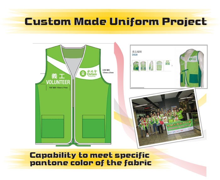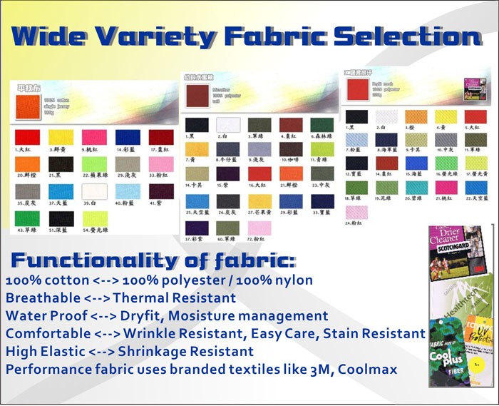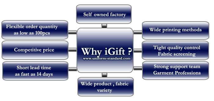 iGift is a corporate uniform provider which devotes to supply a diversified collections of customized work wear, staff uniform, sportswear for various organizations. We are also event-based apparel supplier that tailored your event wear with a broad range of logo designs, from silk screen printing, embroidery to heat transfer and inkjet printing etc.. Our product array includes T-shirt, polo-shirt, vest, hoodie, zip-up, sweater, jumper, blouse, tracksuit, jacket, windbreaker, shirts, pants, shorts, sportswear uniform etc. We also provide custom-made garment styles which actualize your design ideas to real products. Wearing with Comfort is iGift's vision and faith in providing durable, comfortable and functional customized uniform wear that suits your needs and elevates your company image. iGift offers products which balance among different attributes - quality, delivery, after-sales services and your budget. Our professional customer service team provides the most appropriate fabric choices and style constructions by prioritizing your needs and concerns. Fitting Your Needs with a Variety of Fabrications: Knitted Fabric (100% cotton, CVC, T/C,100% polyester): 1. T-shirt, Polo-shirt, Vest - Single jersey, Pique, Interlock, Ribs. 2. Sportswear with functional applications - 3. Sweater, Pullover, Zip Up: French Terry, Velour, Fleece, Polar fleece. Woven / Synthetic Fabric (100% cotton, CVC, T/C, 100% polyester): 1. Jacket, Windbreaker, Outerwear - Microfiber, Talson, Taffeta (water repellent, wind shielding,breathable PU coating) 2. Shirt, Casual Bottoms, Pants - Twill, Poplin, Satin (durable, wrinkle free, easy care) Quality and Service Driven, despite iGift offers a wide range of fabric selection that provides flexibilities to fit your needs, it is inevitable that each fabrication will has its own physical limitations due to material compositions and the knitting constructions. General observable facts such as color deviation and fading, shrinkage and appearance after washing will occur after continuous usage and repeated washing. We have professional sales representatives who will help customer during the choice of fabrics, however, we encourage customers to raise their quality concerns and other requirements during enquiry stage so as to provide us more information on selecting the most suitable fabric in order to minimize the potential issues during bulk production. I About iGift – Total solution at your doorstep iGift is an energetic, and creative one-stop sourcing solution and value-added services provider, we are flexible in OEM design and customization to suit your needs. Our merchandise ranges from event wear & uniforms to various accessories that create a total package solution for customers. Our self-owned factory, which has over 20 years of experience in textile and accessories, is located in Zhongshan – a city in One-stop customs clearance services, deliver goods at your door step. Factory: